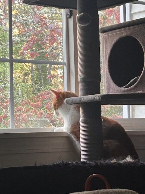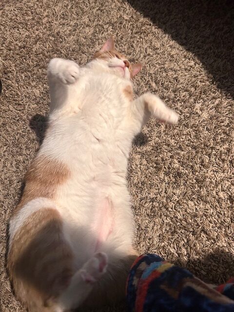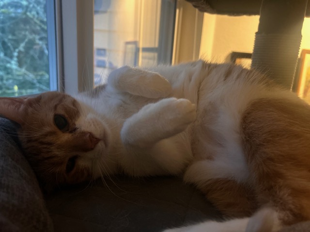 She is so much fun, so loves to talk to me and play with wand toys. She loves climbing around the cat tree, and is really enjoying the birds coming out as we move into spring. She loves having her tummy pet, and has started cuddling in bed with me too.